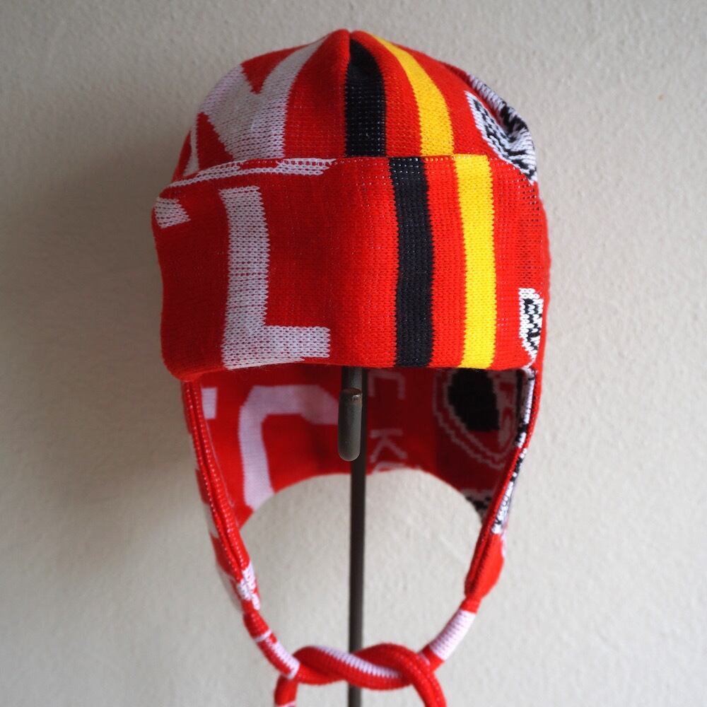 ヨーロッパのFCスカーフ(マフラー)をメイクオーバーした、ニットトラッパーキャップ。